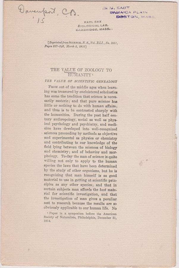 Description 1915. Reprinted from Science, N.S., Vol. XLI, No. 1058, pp. 337-342. Ownership stamps: Karl Sax and E.M. East. First separate edition. Offprint. Original wrappers. *