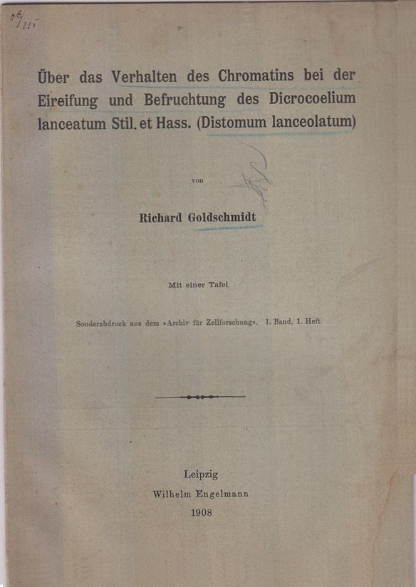 Uber das Verhalten des Chromatins bei der Eireifung und Befruchtung des Dicrocoelium lanceatum Stil. Et Has. (Distomum lanceolatum) by Goldschmidt, Richard