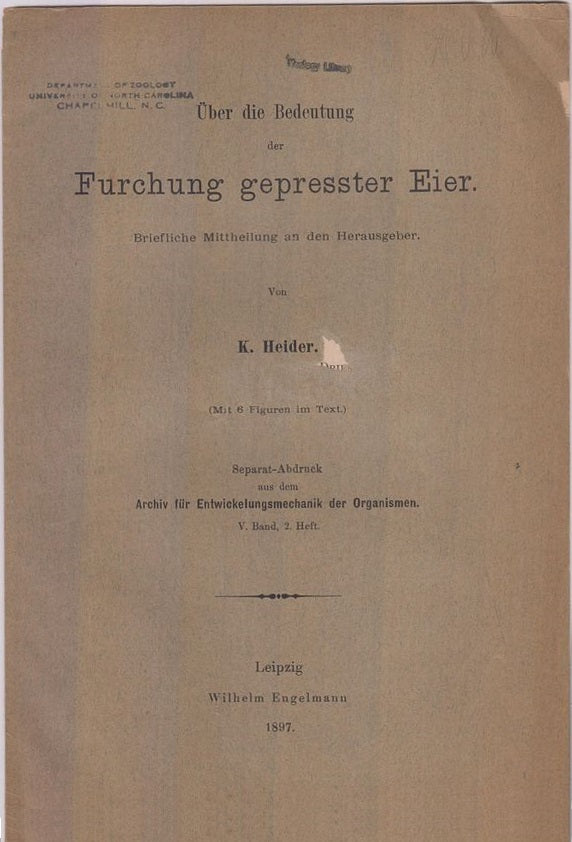 Repritned from Archiv fur Entwickelungsmechanik der Organismen, V. Band, 2. Heft. First separate edition. Offprint. Original wrappers. * |