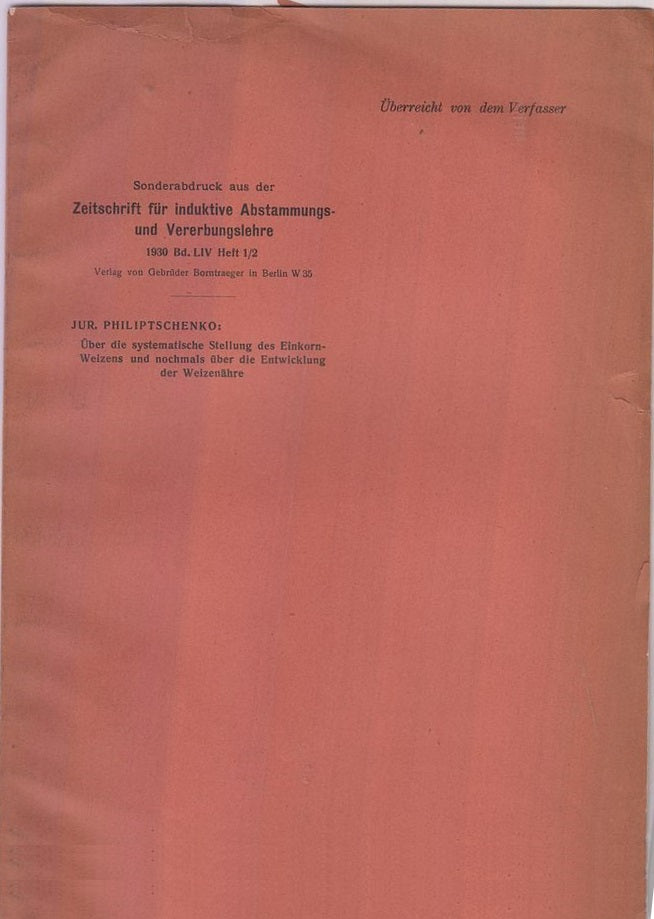 Reprinted from Zeitschrift fur induktive Abstammungs- und Vererbungslehre. 1930, Bd. LIV, Heft ?. First separate edition. Offprint. Original wrappers. * |