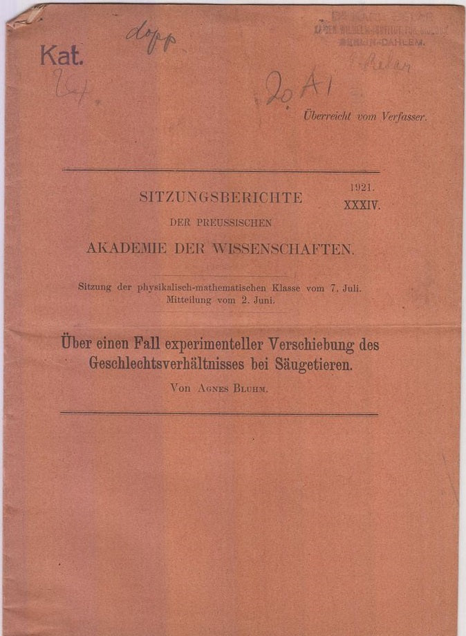 Uber einen Fall Experimenteller Verschiebung des Geschlechtsverhaltnisses bei Saugetieren by Bluhm, Agnes