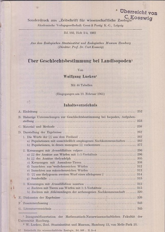 Reprinted from Zeitschrift fur Wissenschaftliche Zoologie bd 166, heft 34 1962. First separate edition. Offprint. Original wrappers. * |