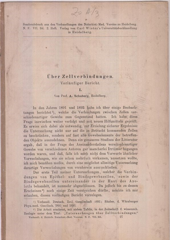 Description Reprinted from Verhandlungen des Naturhist.-med. VII. Band, 2. heft. First separate edition. Offprint. Original wrappers. *
