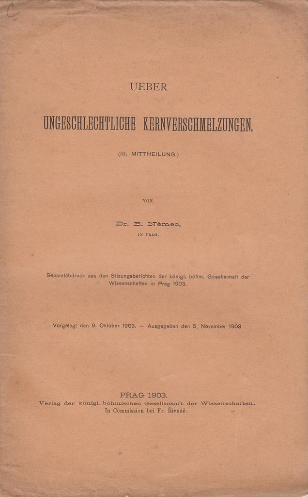 Sitzungsberichten der Konigl, bohm. Gesellschaft der Wissenschaften in Prag 1903, pp. 1-11.* B. Nemec "Significantly contributed in the examination of plant cells, supporting research and growth regulatory substances - plant hormones . He is credited with the first division of organisms into eukaryotes and prokaryotes." Wikipedia-Czech Some splitting to spine else very good. Antiquarian science. Botany. First edition. Offprint. |
