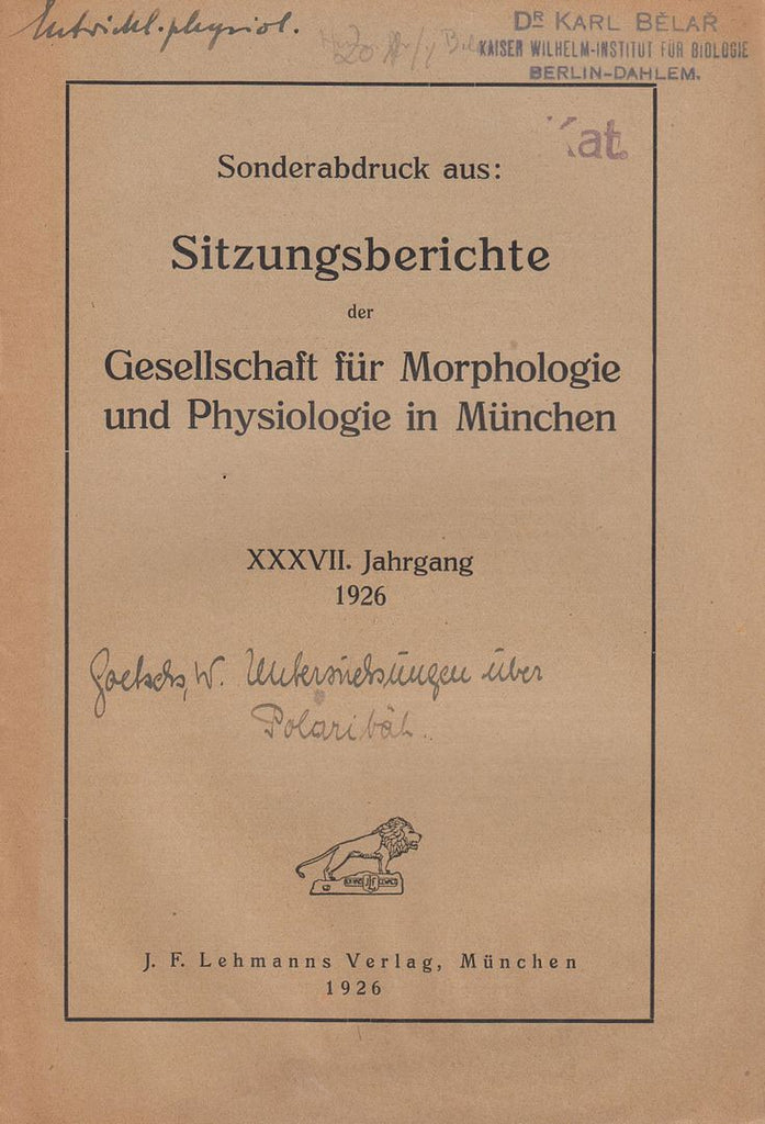 Description Sitzungsberichte der Gesellschaft fur Morphologie und Physiologie in Munchen, Vol. XXXVII, 1926, pp. 6-12. First edition. Offprint. Very good condition. Name stamp of Dr. Karl Belar on front cover.*