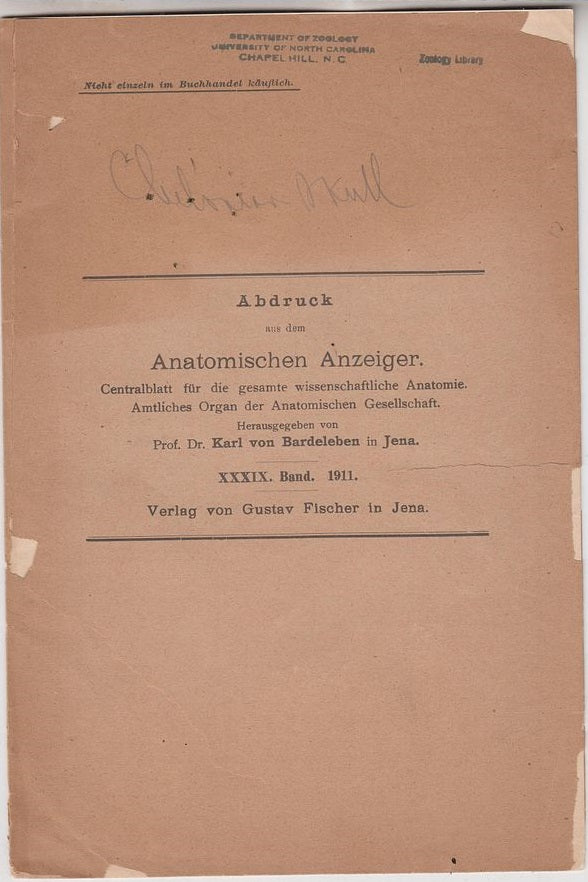 1911. Reprinted from Anatomischen Anzeiger. XXXIX Band. Ownership stamp of UNC Dept. of Zoology. First separate edition. Offprint. Original wrappers. * |