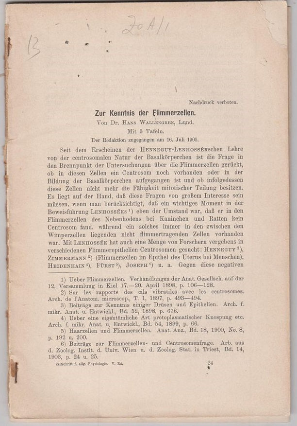 1905. Reprinted from Zeitschrift f. allg. Physiologie. V. Bd. First separate edition. Offprint. Original wrappers. * |